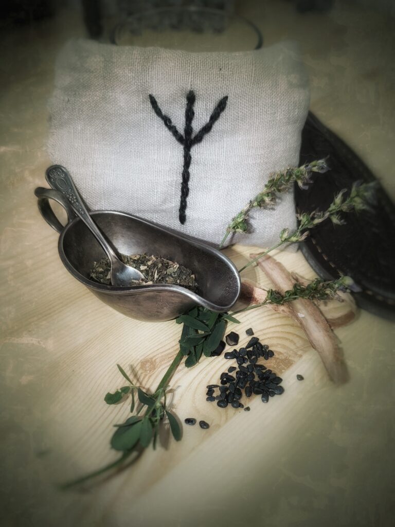 a pokud mohu, zjistím si růst dané byliny a jedu si ji nasbírat ručně. To vše je velmi časově náročné a vyžaduje znalosti jak magické, tak i zkušenosti s magickým sběrem bylin a samozřejmě komunikaci s místními duchy a bytostmi, abych si sběrem odnesla opravdu „energii v rostlině“ a ne nasrání duchů a suchou kytku. - Vlastní znak a bindruna: do každého škapulíře přidávám speciální runu, kterou vymýšlím Vám na míru a zakomponovávám do celého kouzla. Často se stane, že když už mám runu hotovou, tak se síla záměru změní a musím přizpůsobit celou dosavadní práci tak, aby si byliny a energie sedly. Škapulíř je živý organismus, bytost, kterou skládám od duše přes mysl po tělo, a je nutné pracovat s ní s citem. Po získání a vložení runy se mi objeví takový mozek celého škapulíře, který mi jemně ale rázně pomáhá určit další kroky.